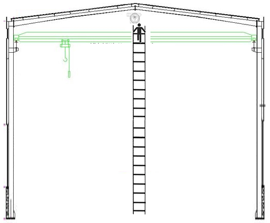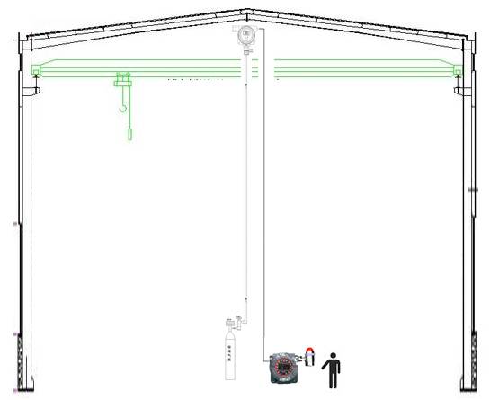 針對(duì)輕于空氣的可燃有毒氣體的檢測(cè),一般會(huì)在廠房最高處易于聚集氣體的位置安裝氣體檢測(cè)器。氣體檢測(cè)器需要定期做校準(zhǔn)和維護(hù),此時(shí)就涉及到如何維護(hù)的問題,傳統(tǒng)的做法是維護(hù)人員攜帶工具及標(biāo)準(zhǔn)氣瓶爬梯子上到高處予以維護(hù),危險(xiǎn)性大,可操作性差。具體做法如下圖所示。