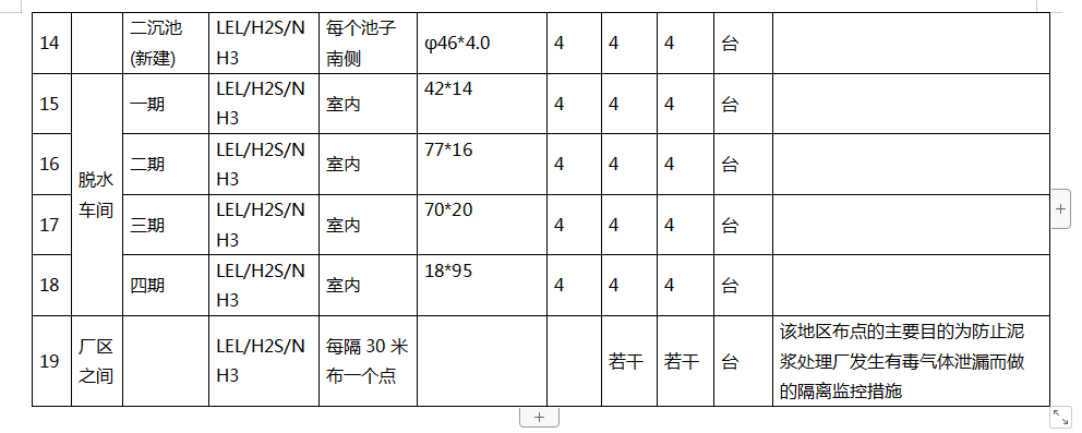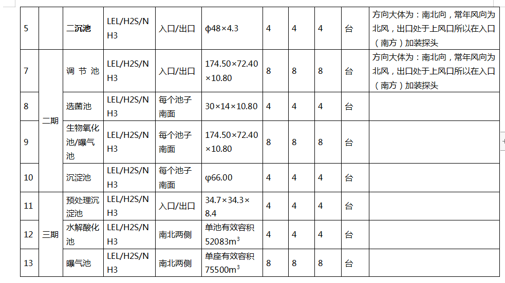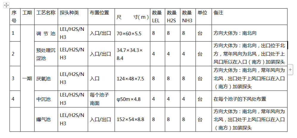 1.1.2 根據(jù)污水處理廠的常用監(jiān)控氣體種類為:可燃?xì)狻?/span>H2S和NH3,建議設(shè)置VOC檢測(cè)器,以檢測(cè)有機(jī)揮發(fā)物。因此在每個(gè)監(jiān)控點(diǎn)上均布置相同的可燃?xì)?、H2S和NH3 探頭。