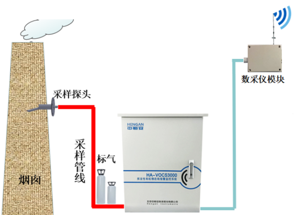 說明:由于現(xiàn)場排放尾氣溫度高(100攝氏度以上),并且濕度太大,傳感器直接測量會影響使用壽命,故加裝HA-VOCS3000A預(yù)處理系統(tǒng),內(nèi)置抽氣泵將尾氣抽取到監(jiān)測系統(tǒng)進(jìn)行降溫,除濕等操作后輸送到MIC-600氣室進(jìn)行有害因子檢測,并將檢測后的信號通過無線模塊上傳當(dāng)?shù)丨h(huán)保部門進(jìn)行集中監(jiān)控。