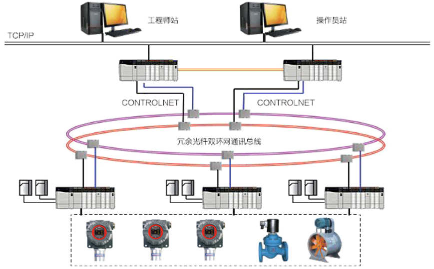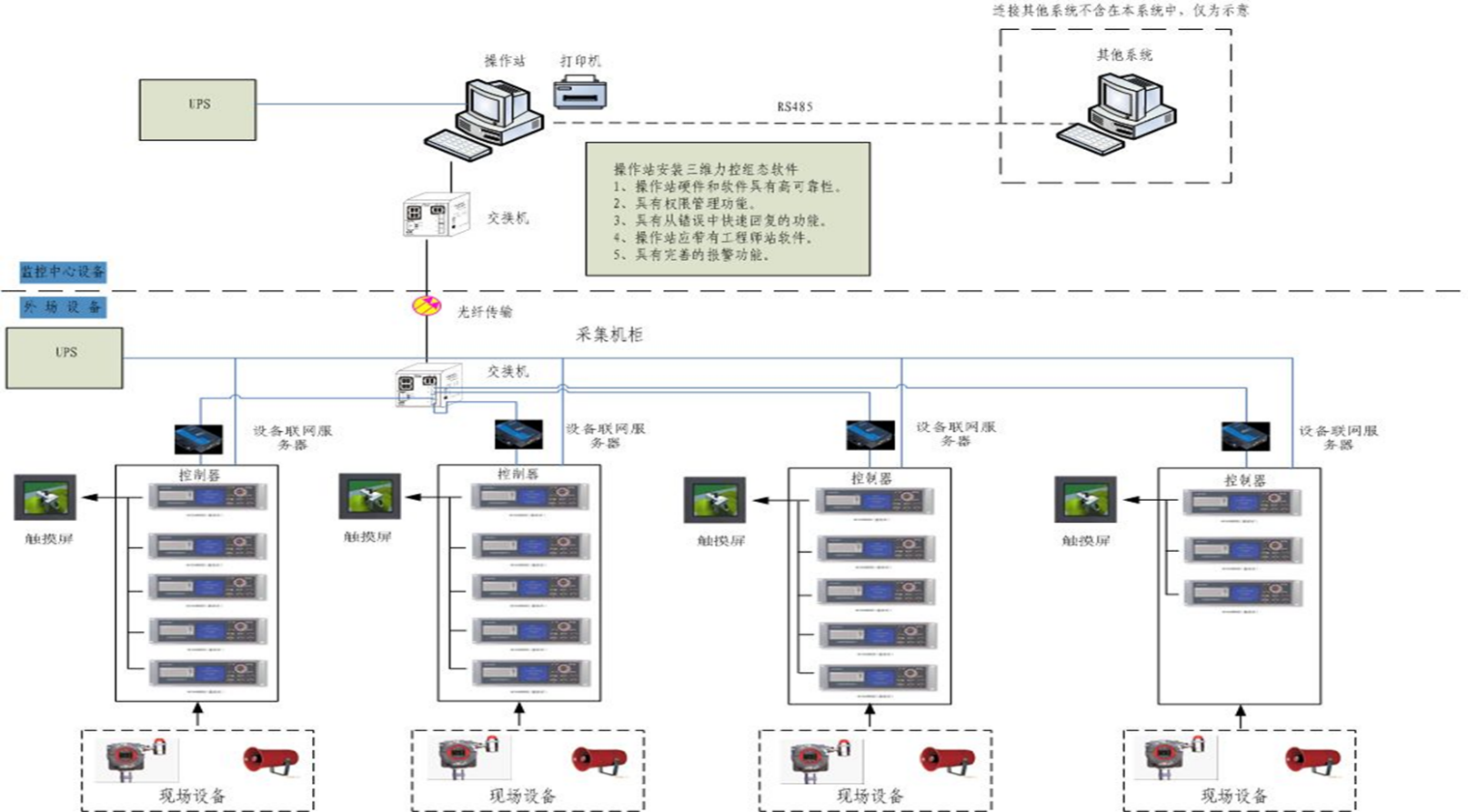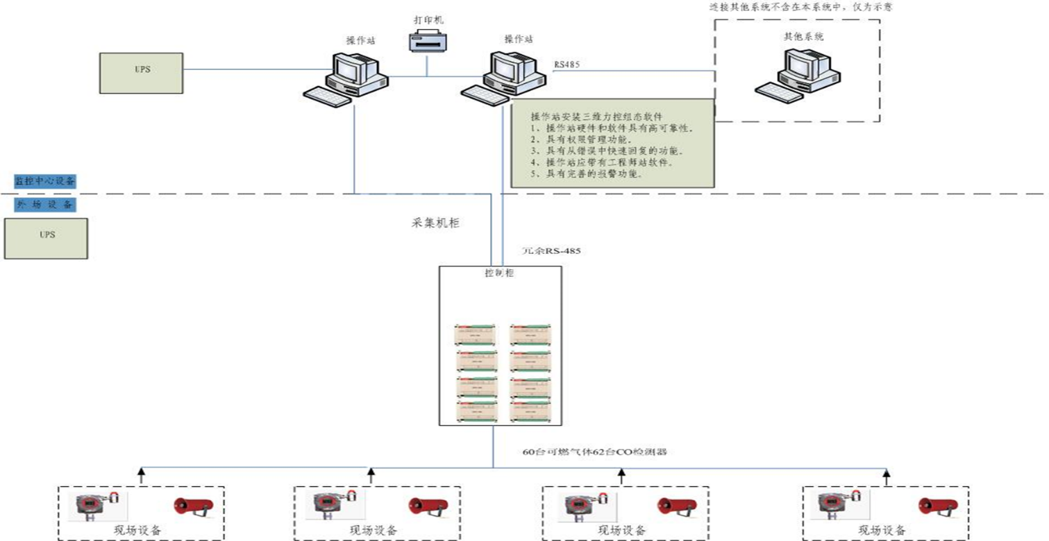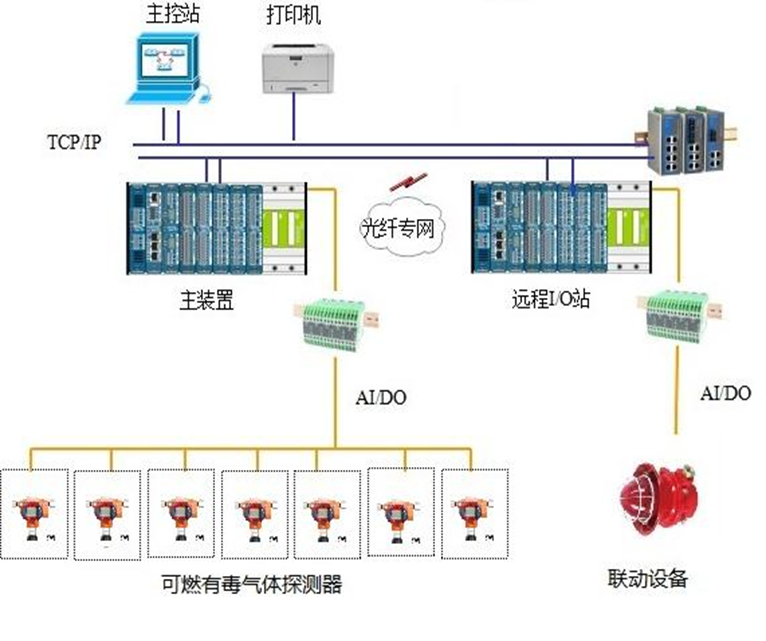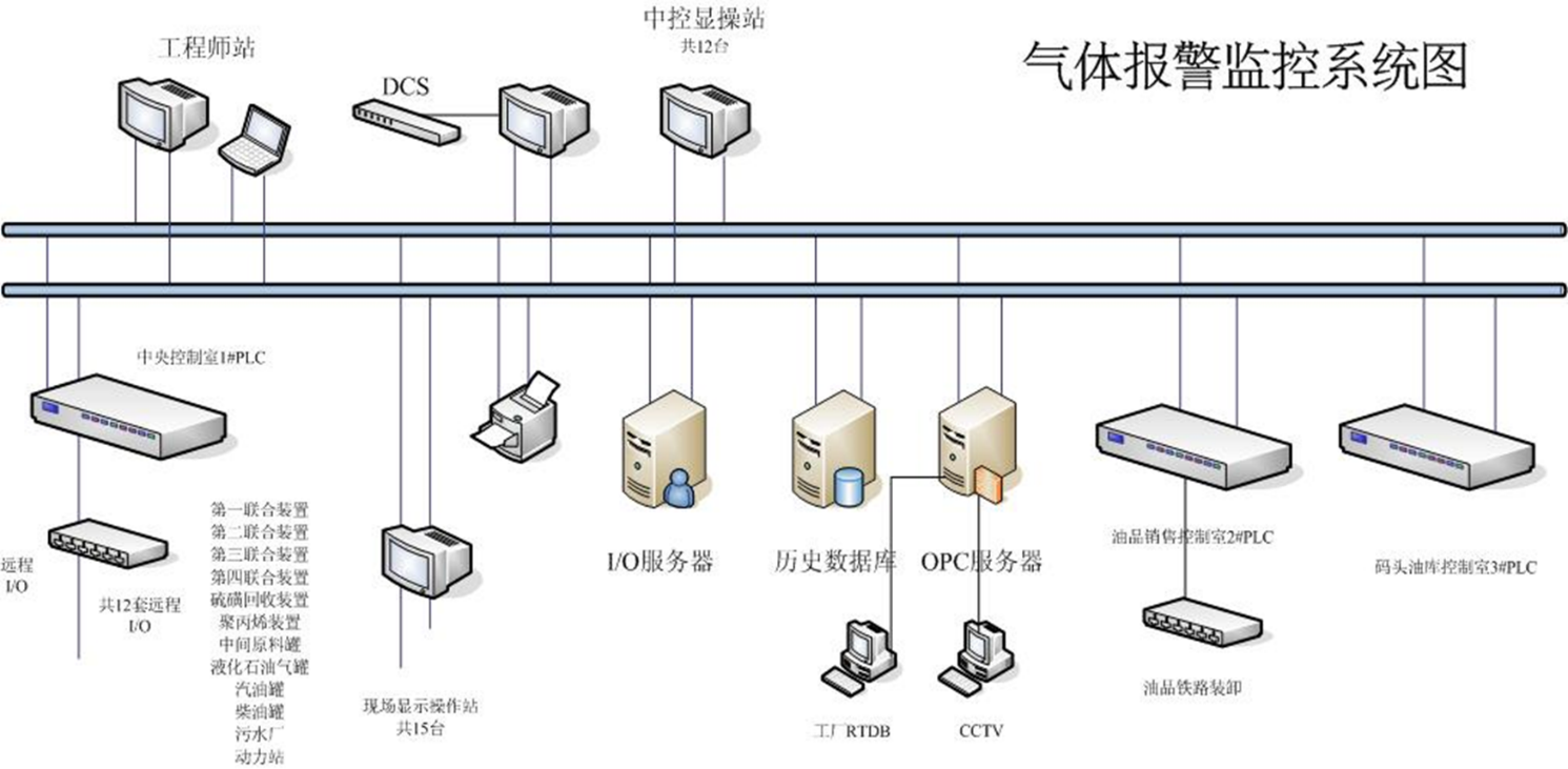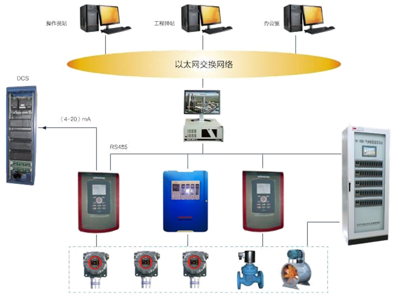系統(tǒng)由安裝在現(xiàn)場(chǎng)的可燃/有毒氣體探測(cè)器和安裝在控制室內(nèi)的控制單元、數(shù)據(jù)采集模塊、工作站等組成。通過(guò)數(shù)據(jù)采集模塊對(duì)現(xiàn)場(chǎng)檢測(cè)器實(shí)施數(shù)據(jù)采集,并通過(guò)通訊模件完成于操作員站或第三方系統(tǒng)(設(shè)備)之間的通訊,接受相關(guān)信息并傳遞實(shí)時(shí)數(shù)據(jù)。
