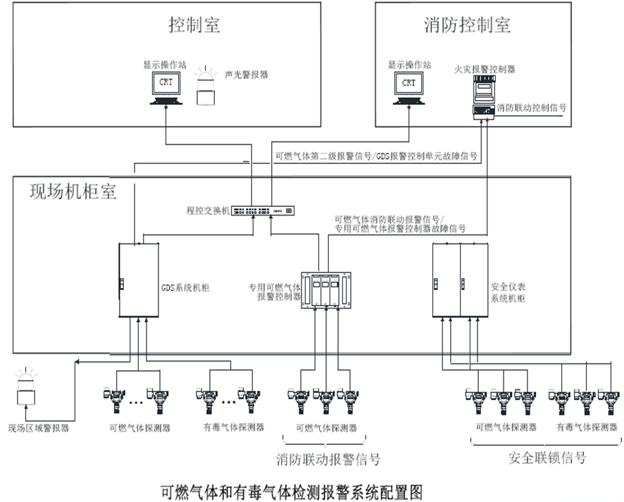 探測(cè)器信號(hào)用于警示報(bào)警時(shí),GDS報(bào)警控制單元采用獨(dú)立設(shè)置的以微處理器為基礎(chǔ)的電子產(chǎn)品即可,既不需要取得SIL認(rèn)證,也不需要取得消防產(chǎn)品型式檢測(cè)報(bào)告;探測(cè)器信號(hào)用于消防聯(lián)動(dòng)時(shí),GDS報(bào)警控制單元應(yīng)采用取得國(guó)家消防電子產(chǎn)品質(zhì)量監(jiān)督檢驗(yàn)中心型式檢測(cè)報(bào)告的專用可燃?xì)怏w報(bào)警控制器;探測(cè)器信號(hào)用于安全聯(lián)鎖時(shí),根據(jù)《石油化工安全儀表系統(tǒng)設(shè)計(jì)規(guī)范》GB/T 50770有關(guān)規(guī)定,SIL1及以下安全等級(jí)的聯(lián)鎖信號(hào)可接入GDS,SIL2及以上安全等級(jí)的聯(lián)鎖信號(hào)應(yīng)接入SIS 。