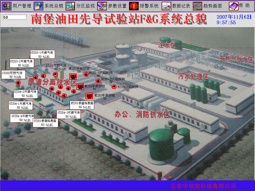 顯示及報(bào)警畫(huà)面將總貌畫(huà)面、分區(qū)畫(huà)面及單個(gè)探測(cè)器信息畫(huà)面。總貌畫(huà)面將包括各個(gè)裝置和公用工程部分等,分區(qū)畫(huà)面為裝置內(nèi)的探測(cè)器位號(hào)及布置位置、報(bào)警信息等。用鼠標(biāo)點(diǎn)擊某一分區(qū)就可把界面轉(zhuǎn)入分區(qū)顯示狀態(tài)。現(xiàn)場(chǎng)任一探測(cè)器故障報(bào)警時(shí),總貌畫(huà)面內(nèi)對(duì)將的裝置將閃爍或自動(dòng)彈出分區(qū)畫(huà)面。