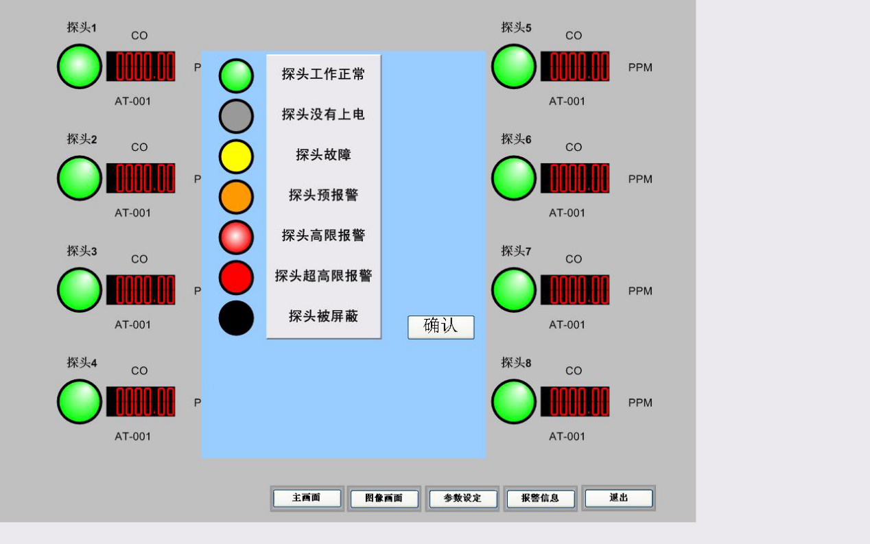 1.1 濃度顯示:控制器系統(tǒng)能顯示現(xiàn)場(chǎng)的被測(cè)氣體濃度信度息(單位用戶可選)。每一探頭在控制器系統(tǒng)界面中都有對(duì)將的分區(qū)域的濃度顯示框,濃度顯示框顯示對(duì)將的探測(cè)器氣體濃度。
