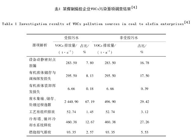 目前,我國只有少數現代煤化工企業(yè)開展了VOCs核查。表1為某煤制烯烴企業(yè)VOCs的源項核查結果(將氣化灰水及污水汽提塔底凈化水分為受控污水和非受控污水2種情況)[4]。