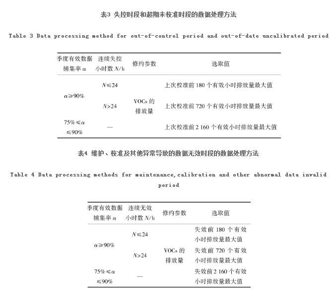 數據審核方面,可參照HJ 75提出有效數據捕集率全年必須達75%。失控時段的數據可按照表3中的方法對VOCs排放量進行修約,非甲烷總烴濃度和廢氣參數不修約。故障期間、維修期間的數據,可使用參比方法監(jiān)測的數據替代,也可按照表4中的方法對VOCs排放量進行修約,非甲烷總烴濃度和廢氣參數不修約。當采用參比方法監(jiān)測的數據替代時,頻次不低于每天1次,參比方法的監(jiān)測過程按照GB/T 16157、HJ/T 397、HJ 732、HJ 38要求進行,替代數據包括非甲烷總烴濃度、廢氣參數和VOCs排放量。維護保養(yǎng)和校準及其他異常導致的數據無效時段,VOCs排放量按照表4處理,非甲烷總烴濃度和廢氣參數不修約。