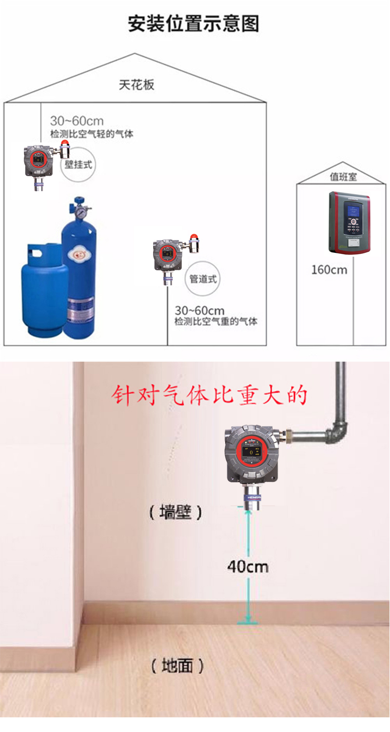 無論是防爆型還是非防爆型探測器,其安裝位置都視檢測對象氣體而異。即當(dāng)檢測氣體比重比空氣輕時,探測器應(yīng)安裝在接近屋頂,泄露氣體容易滯留處。反之,當(dāng)檢測氣體比重比空氣重時,探測器應(yīng)安裝在接近地面,泄露氣體容易滯留處。