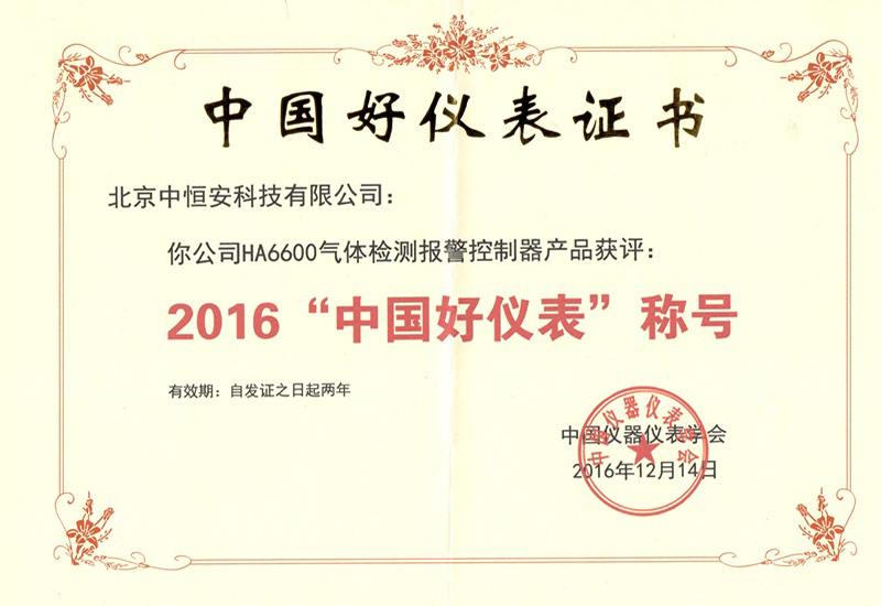 2016”中國好儀表“HA6600獲獎證書