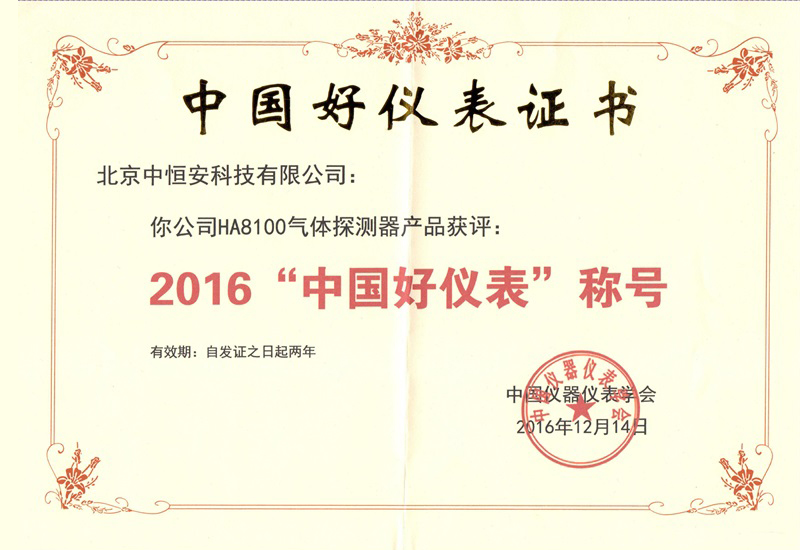 2016”中國好儀表“HA8100獲獎(jiǎng)證書