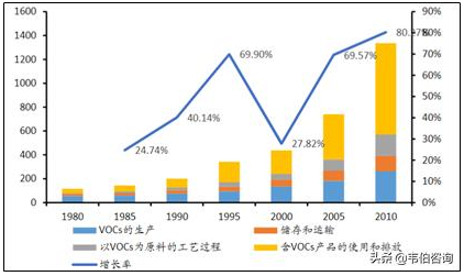另據(jù)渤海證券的數(shù)據(jù):我國工業(yè)源VOCs排放量由1980年的115.1萬噸增長至2010年的1,335.6萬噸,漲幅超過10倍,年均增長率達(dá)到8.5%。其中,2010年石油煉制、建筑裝飾、機(jī)械設(shè)備制造和印刷為VOCs排放的前四大行業(yè),排放量分別為213萬噸、198.7萬噸、140.6萬噸和92.6萬噸。