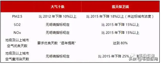 圖表 5:“藍天保衛(wèi)戰(zhàn)”與“大氣十條”主要指標(biāo)對比
