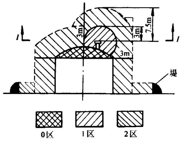圖中所示,對于露天油罐而言,0區(qū)一般存在于油罐的上方,1區(qū)一般存在于油罐呼吸閥的周邊,而其他周邊位置一般為2區(qū)。