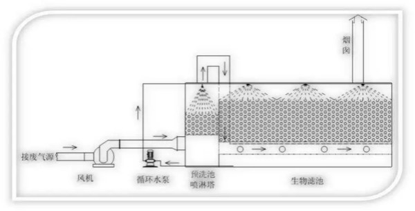 工藝流程:臭氣收集→風(fēng)管輸送→抽風(fēng)機→預(yù)洗池加濕→生物濾池吸收→生物氧化→無害氣體排放