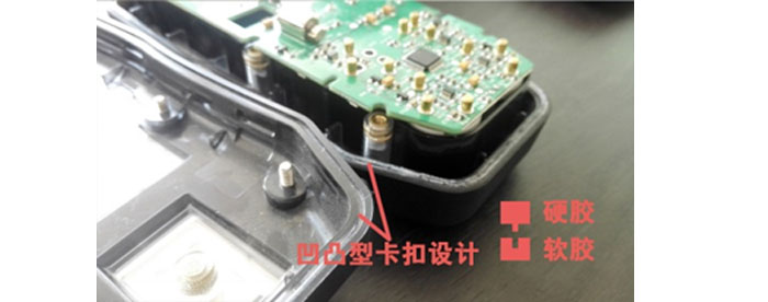 像上圖便攜式氣體檢測儀,采用硬膠+軟膠雙層材料,通過軟硬擠壓形成密封面,可有效防水防塵。
