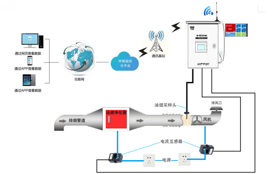 油煙在線(xiàn)監(jiān)測(cè)系統(tǒng)是為了滿(mǎn)足餐飲行業(yè)油煙排放監(jiān)管的需求,利用物聯(lián)網(wǎng)技術(shù)、GPRS無(wú)線(xiàn)通訊及GIS等技術(shù),實(shí)現(xiàn)對(duì)分散餐飲企業(yè)的集中監(jiān)管。系統(tǒng)實(shí)時(shí)監(jiān)測(cè)油煙排放濃度以及凈化器和風(fēng)機(jī)的工作狀態(tài)等信息,結(jié)合餐飲企業(yè)檔案信息管理、智能的數(shù)據(jù)統(tǒng)計(jì)分析及報(bào)警管理功能,為環(huán)境監(jiān)管部門(mén)對(duì)餐飲企業(yè)的管理提供技術(shù)支撐。