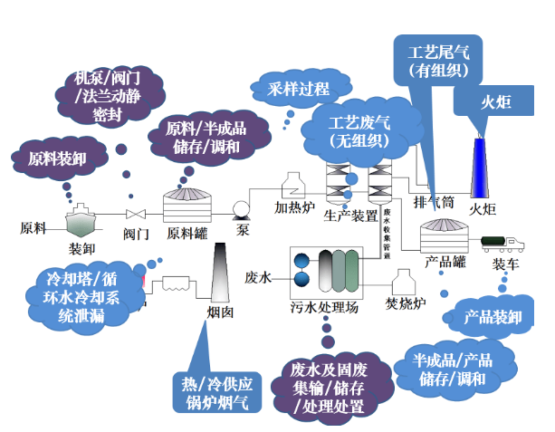 石油煉制工業(yè)大氣污染物排放解決方案 排放特征 煉油與石油化工行業(yè)VOCs主要來(lái)自工藝有組織排放、火炬氣、工藝無(wú)組織排放、有機(jī)液體存儲(chǔ)與調(diào)和揮發(fā)、廢水收集及處理過程、設(shè)備動(dòng)靜密封點(diǎn)泄漏、有機(jī)液體裝卸揮發(fā)、冷卻塔和循環(huán)冷卻水系統(tǒng)等十二個(gè)有組織和無(wú)組織排放源項(xiàng)。其中,VOCs工藝有組織排放占比相對(duì)較小。 ..2021-08-23